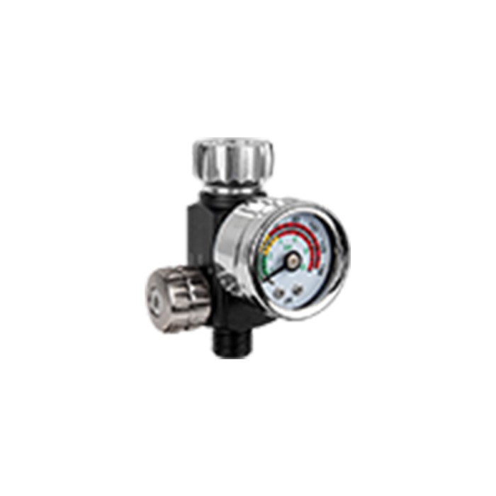 Regolatore di pressione dell'aria compressa con manometro meccanico per impostar il valore di pressione della pistola a spruzzo. Schermo protettivo trasparente in vetro.