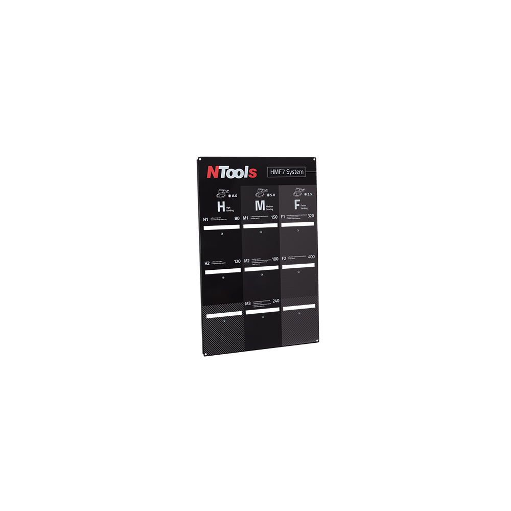 La scheda HMF7 System è uno strumento efficace per organizzare il lavoro in officina. Il piano in acciaio può essere utilizzato sia come pratico portadischi abrasivi (scatole intere) che come appendino per dischi singoli senza scatole. La scheda Sistema HMF7 contiene informazioni sulla suddivisione delle macchine in base alla corsa e dei dischi in base alla gradazione. Un diagramma chiaro mostra come lavorare più velocemente e con maggiore precisione utilizzando NTools. La funzionale scheda HMF7 System è disponibile nella versione da appendere alla parete dell'officina. La scheda viene fornita con le istruzioni e gli accessori necessari per il montaggio della scheda (viti, tasselli, portadischi).