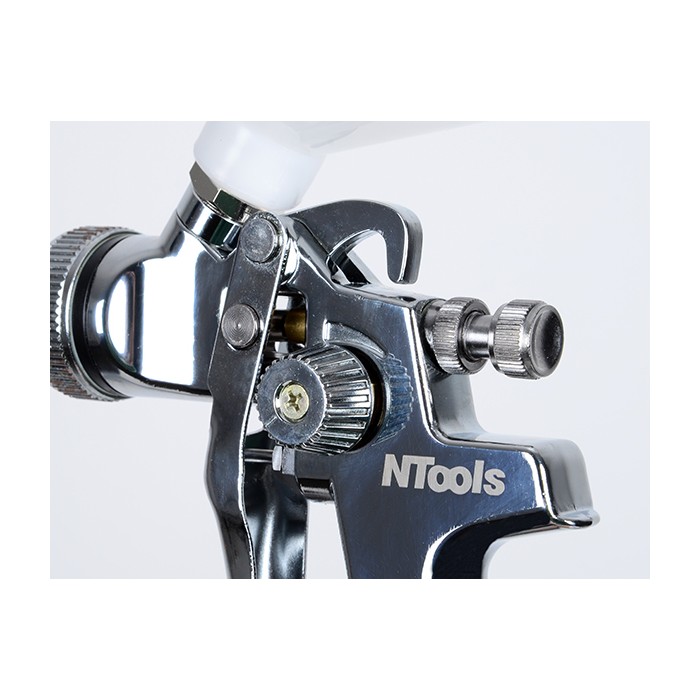 Pistola a spruzzo con tazza superiore in nylon, ideale per l'applicazione di fondi, primer, smalti acrilici, poliuretanici e trasparenti. Grazie alle caratteristiche dell'ugello e al basso consumo di aria compressa, è versatile e ideale per molteplici applicazioni in ambito produttivo e di manutenzione.