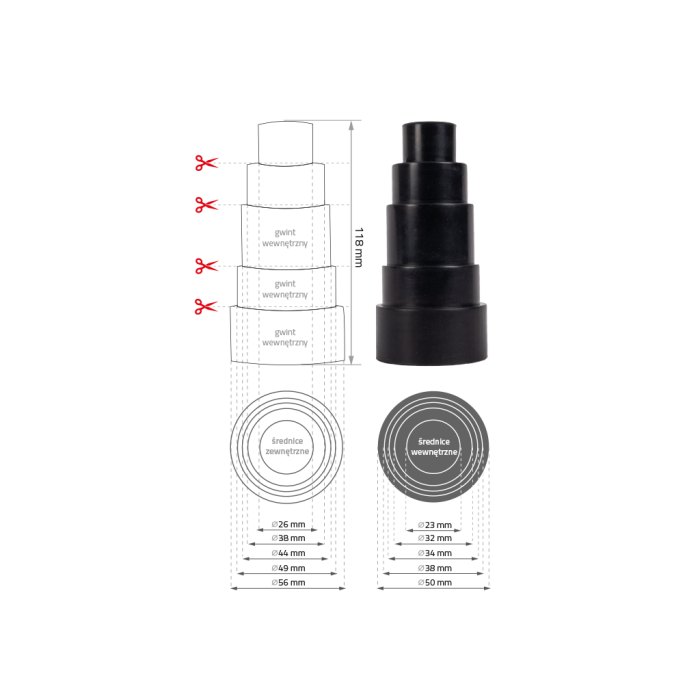 Connettore universale ø23/26 per tubi di aspirazone filettati con diametri esterni di ø32,ø34, ø38 e ø50mm a levigatrici elettiche e pneumatiche. Si monta direttamente sul tubo di scarico della levigatrice con diametro esterno di 23mm o interno di 26mm.
