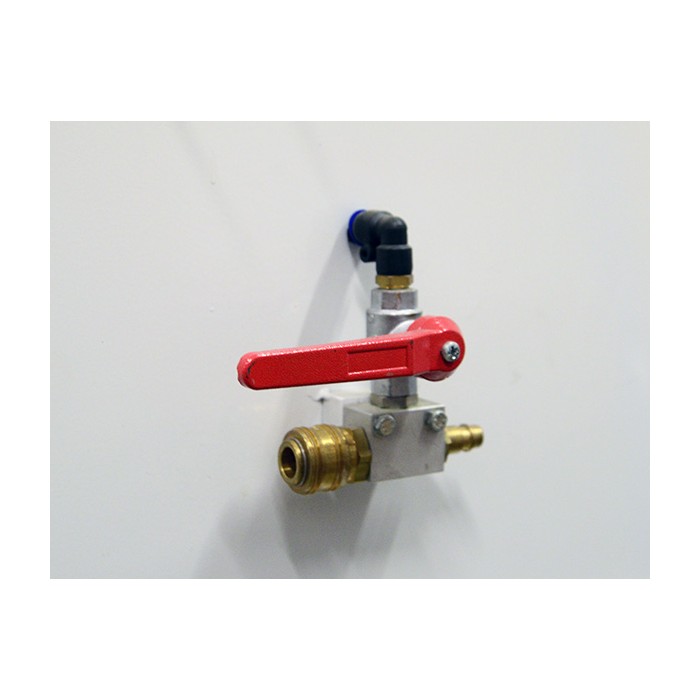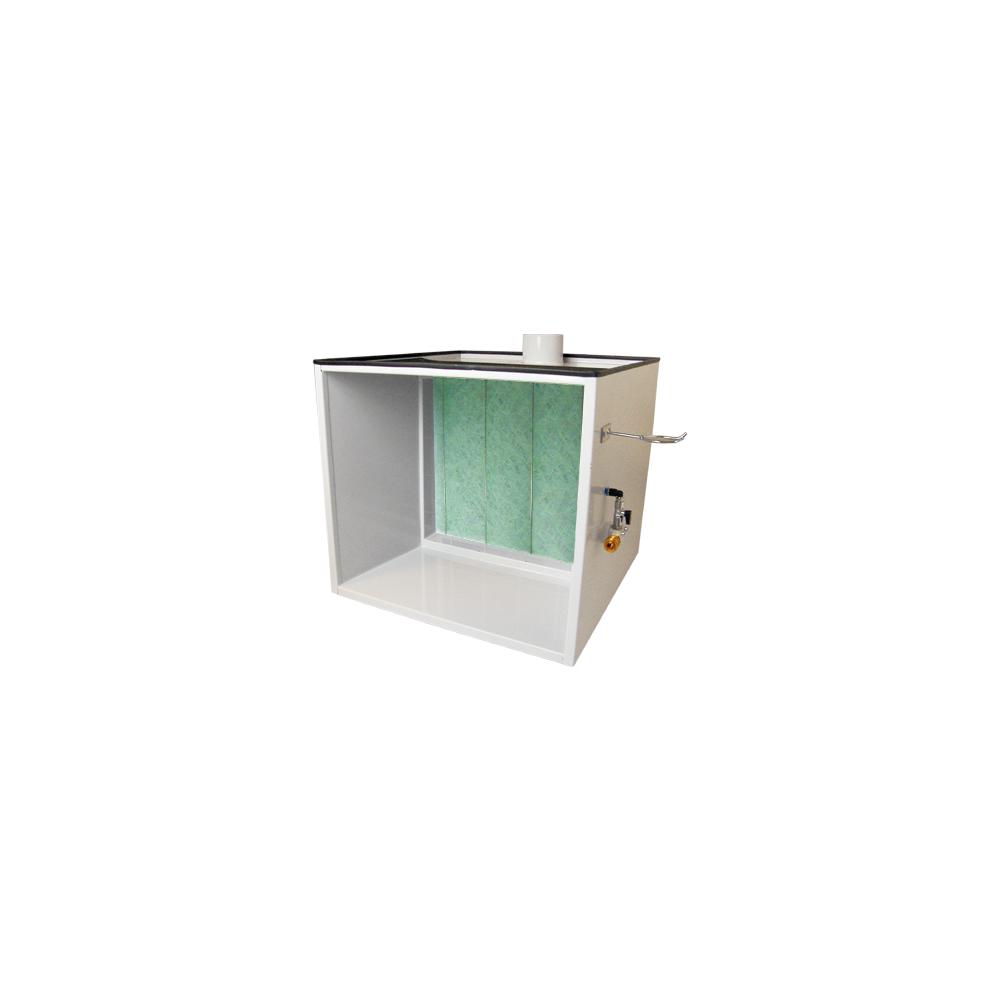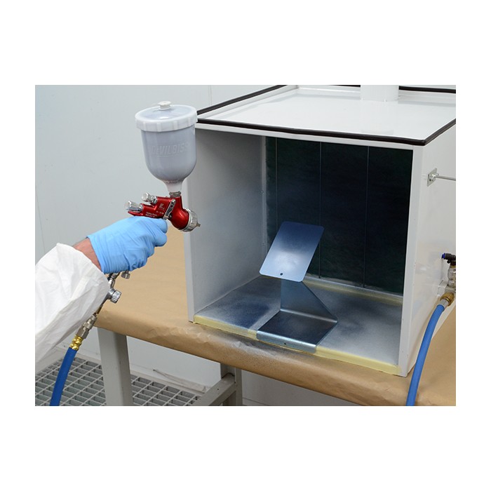 Stand a funzionamento pneumatico per l'estrazione automatica dell'aria durante la spruzzatura. Dotato di filtro preliminare, supporto per campioni, base per l'asciugatura e gancio per appendere la pistola a spruzzo.