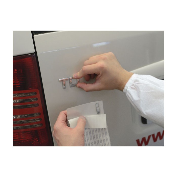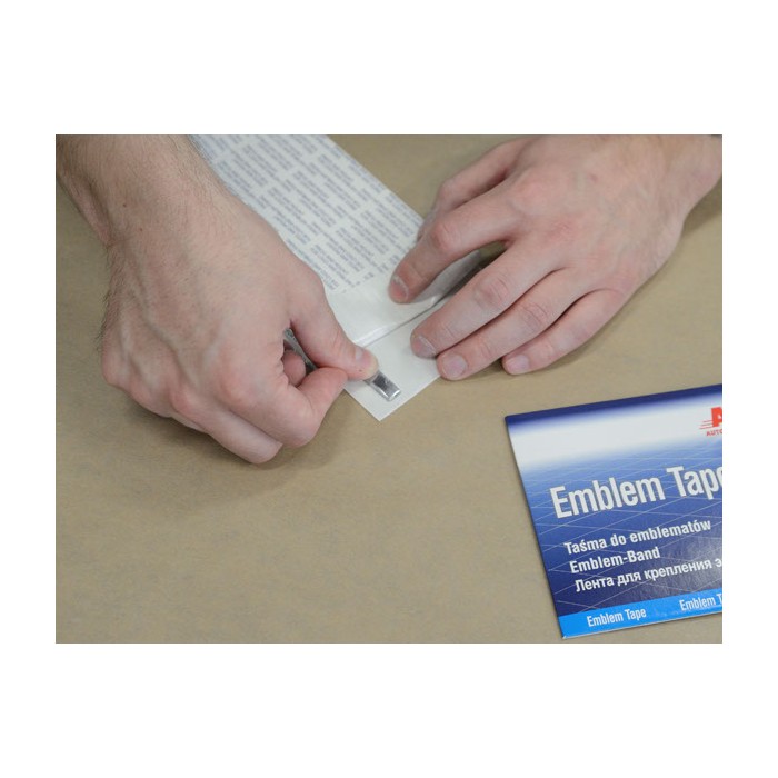 Nastro acrilico trasparente per fissare emblemi e marchi sulla carrozzeria dell'auto. Resistente agli agenti atmosferici, garantisce un'adesione forte e durevole anche dopo lavaggi. Aderenza completa dopo 24 ore.