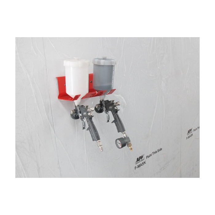 Supporto per il fissaggio di tre pistole a spruzzo a parete. Il magnete sul dorso consente l'installazione in qualsiasi parte della cabina di verniciatura o del supporto per lavaggio pistole.