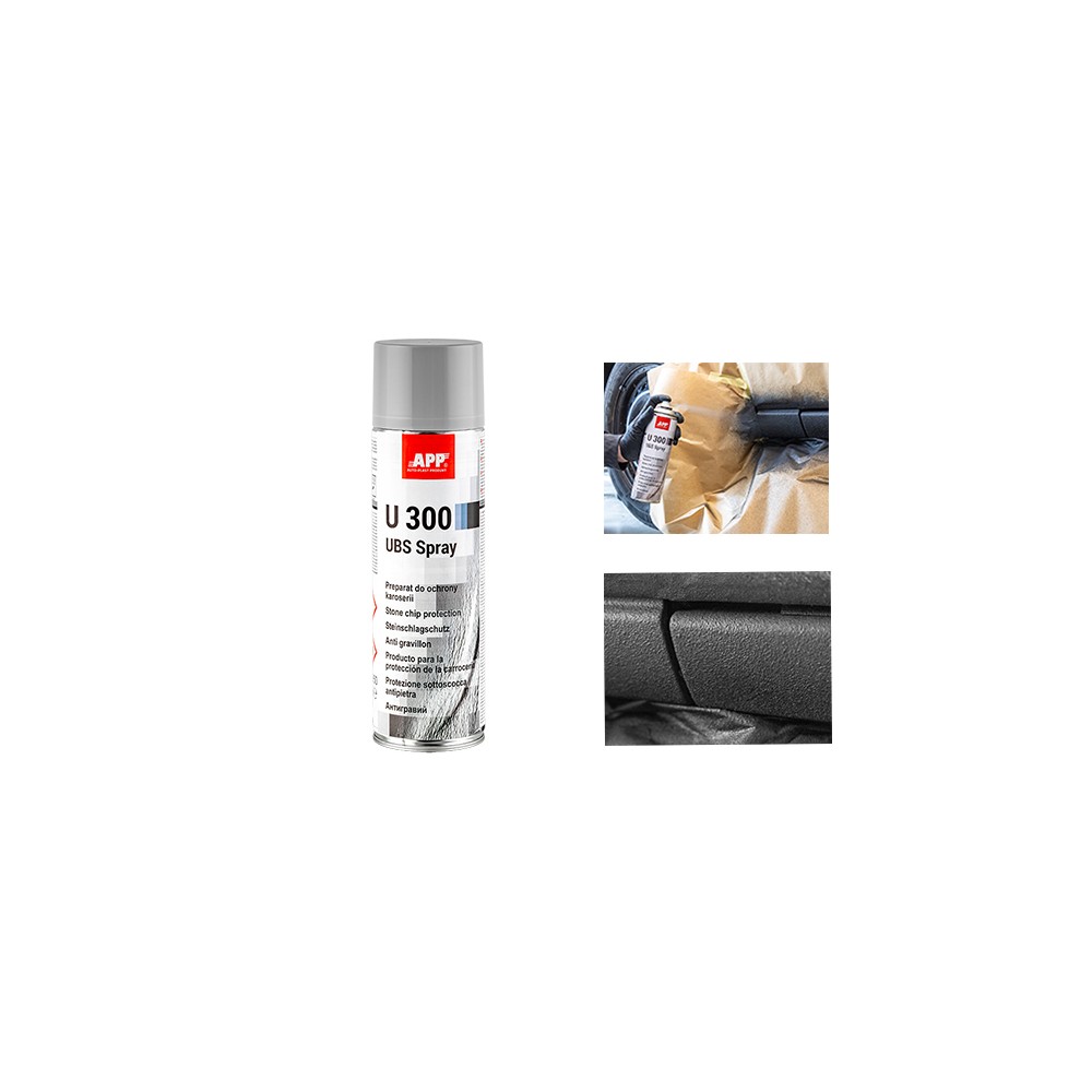 APP U300 UBS Spray è un composto spray elastico a rapida essiccazione e lunga durata. Protegge la superficie della carrozzeria dall'impatto con pietre e ghiaia. Ha proprietà fonoassorbenti, isolanti e anticorrosive. Il rivestimento a basso effetto strutturale che ne risulta può essere sovraverniciato con qualsiasi tipo di finitura. Non contiene bitume o asfalto.