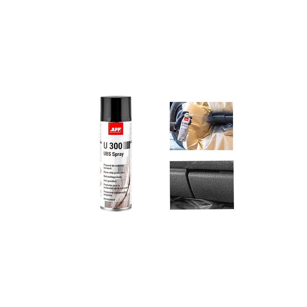 APP U300 UBS Spray è un composto spray elastico a rapida essiccazione e lunga durata. Protegge la superficie della carrozzeria dall'impatto con pietre e ghiaia. Ha proprietà fonoassorbenti, isolanti e anticorrosive. Il rivestimento a basso effetto strutturale che ne risulta può essere sovraverniciato con qualsiasi tipo di finitura. Non contiene bitume o asfalto.