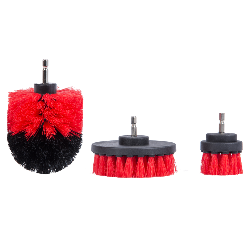 Set di tre spazzole con setole dure, ideali per la pulizia di interni auto, cerchi, pneumatici e per usi domestici.