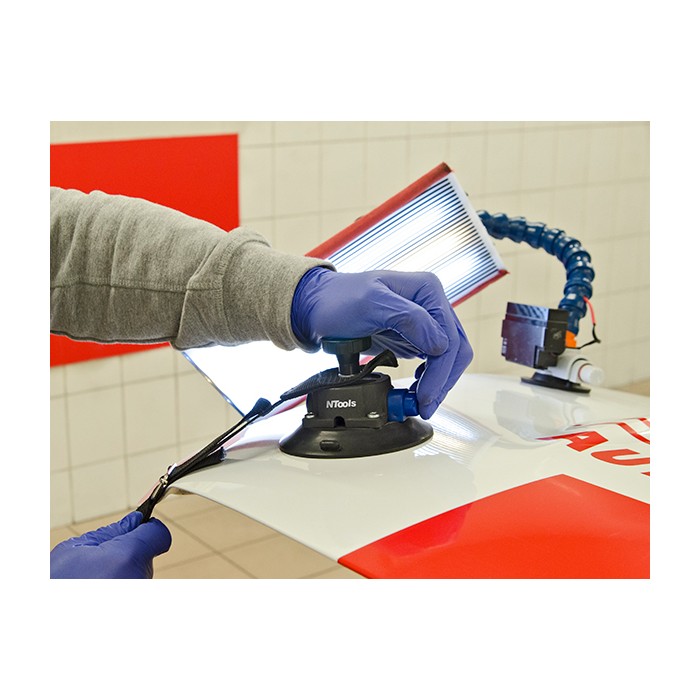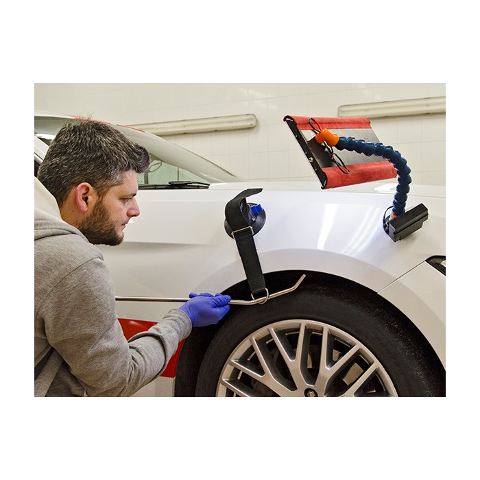 Supporto a ventosa con gancio regolabile e corpo in lega di alluminio, adatto a riparazioni su superfici curve della carrozzeria. Realizzato in poliestere resistente, previene graffi e garantisce un fissaggio stabile. Dotato di copertura per evitare accumulo di sporco.