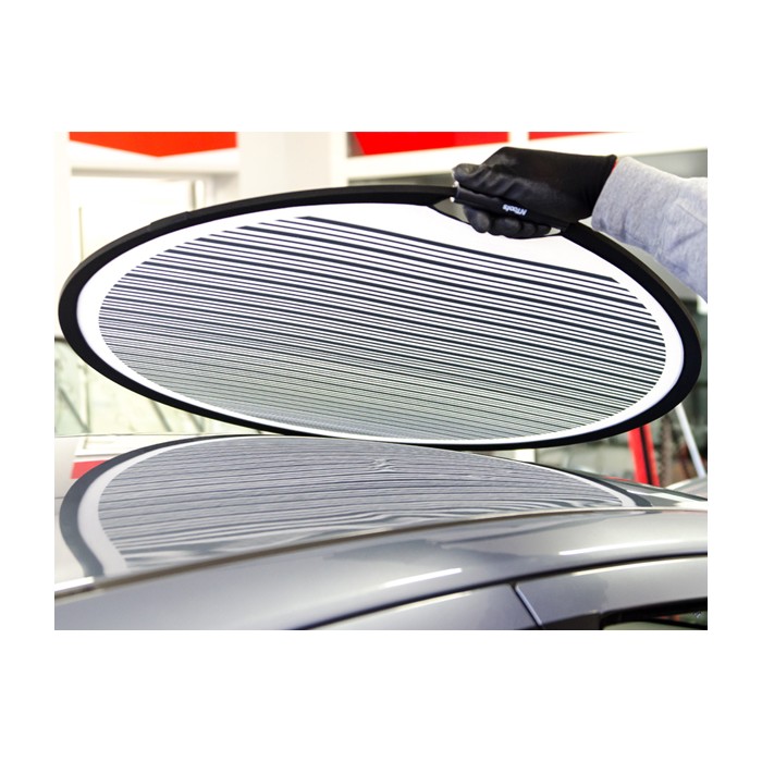 Pannello pieghevole e leggero per individuare deformazioni della carrozzeria, con strisce nere su fondo bianco per facilitare l'ispezione e la valutazione dei danni. Fornito con custodia per protezione e conservazione.
