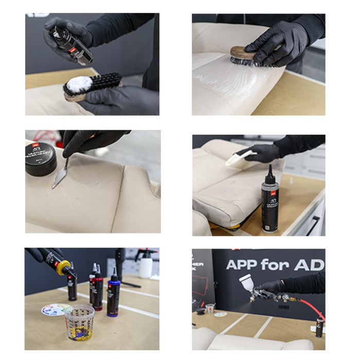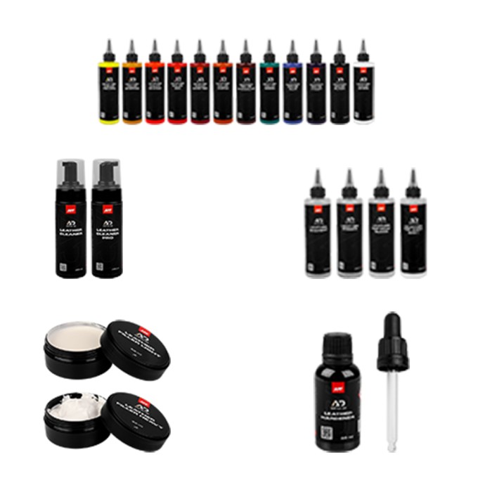 Sistema completo per la tintura, riparazione, pulizia e manutenzione di pelli naturali, sintetiche e plastiche. Include detergenti, pigmenti, primer, indurente, solvente e filler per riparare crepe e graffi. Offre finiture opache o lucide, combinabili per ottenere la brillantezza desiderata.