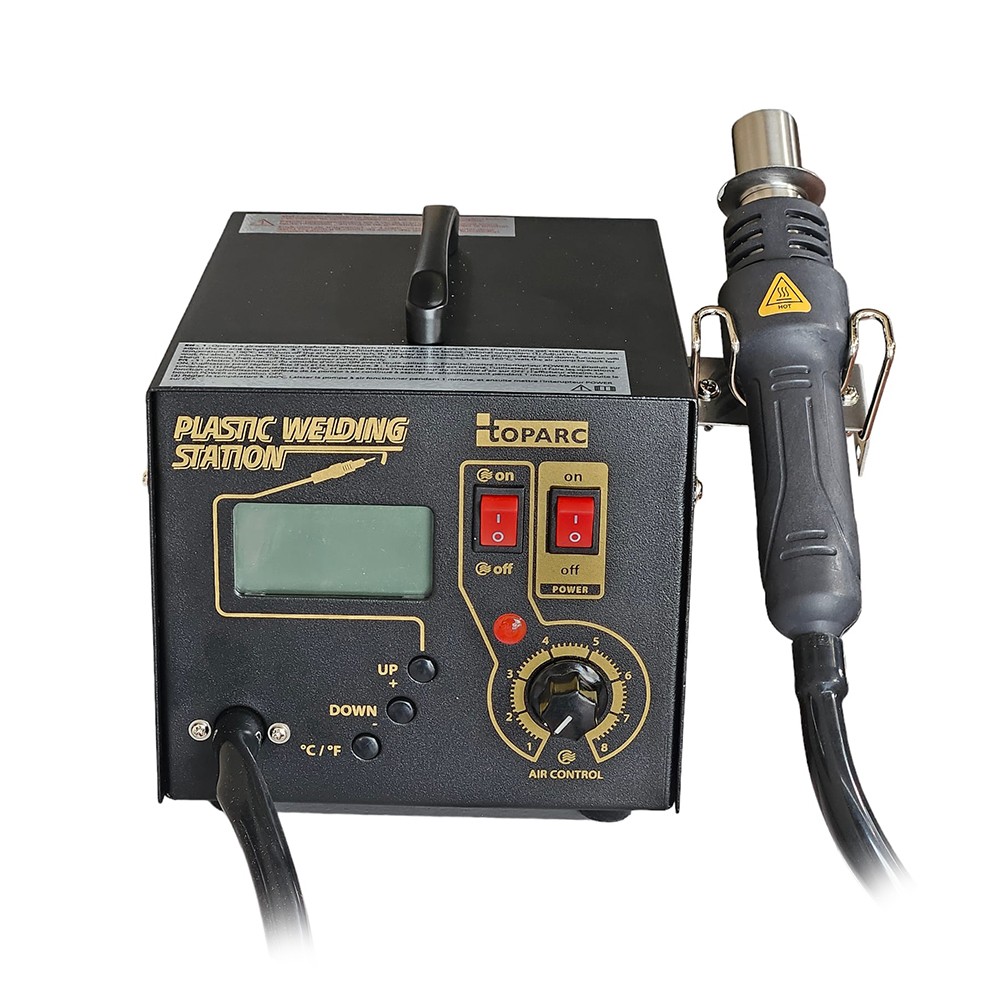 Saldatore per plastica ad aria calda con ampio intervallo di temperatura regolabile (160-480°C). Riscalda la plastica fino al punto di fusione, rendendola malleabile e facilmente riparabile. Il flusso d'aria è regolabile per garantire una fusione omogenea della plastica.