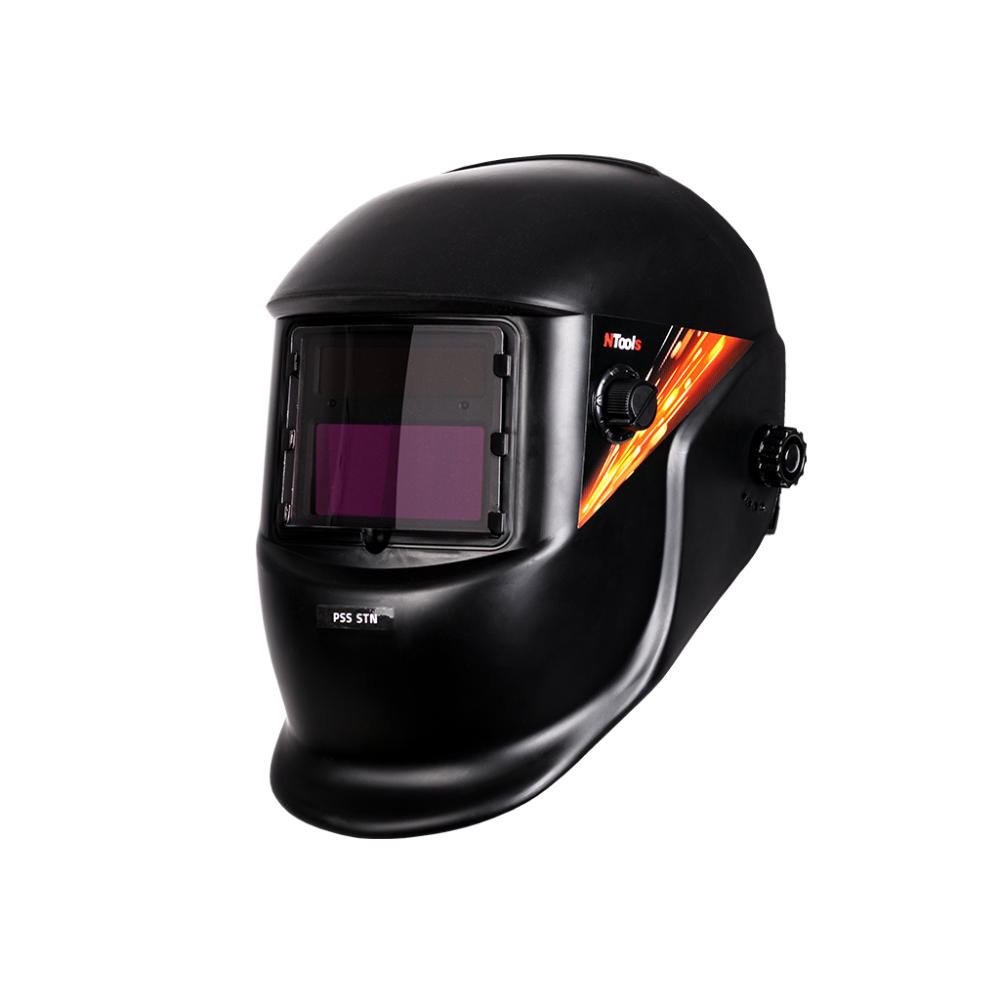 NTools PSS STN è un casco per saldatura auto-oscurante progettato per proteggere occhi e viso da scintille, schizzi e radiazioni nocive in normali condizioni di saldatura. I filtri auto-oscuranti passano automaticamente da scuri a chiari quando l'arco di saldatura si spegne.