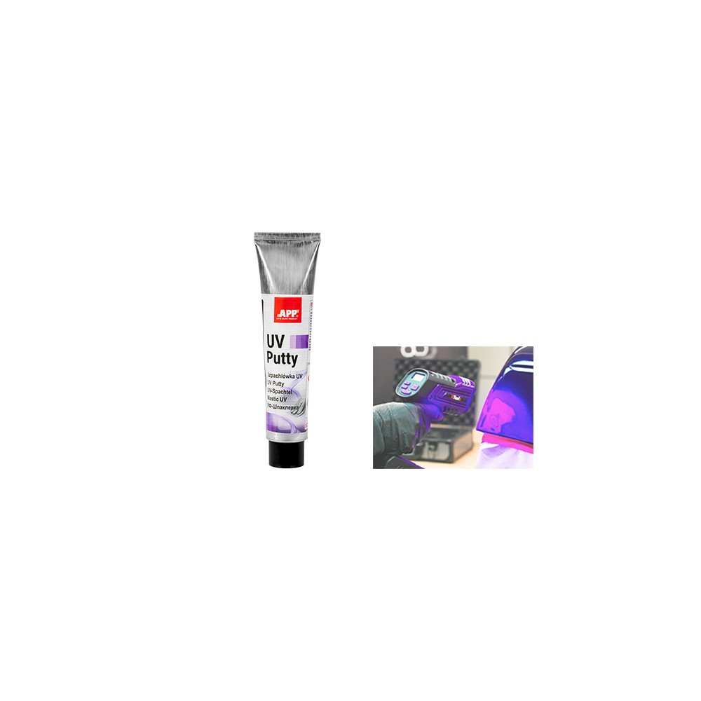 APP UV Putty è uno stucco monocomponente a polimerizzazione UV. È progettato per piccole e medie riparazioni, ad esempio SPOT / SMARTrepair. Ha un'ottima adesione su acciaio, acciaio zincato, alluminio e plastica. Facile da usare. Riduce significativamente i tempi di asciugatura e riparazione.