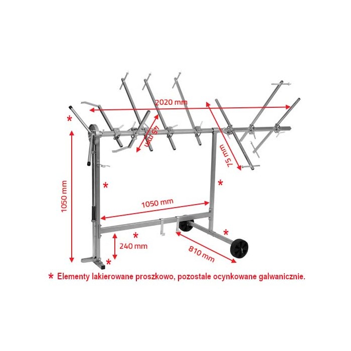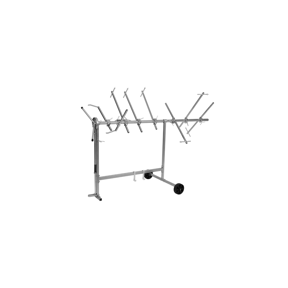 Supporto girevole a 360° con sei ganci universali e due ganci per elementi in palastica, fissati tramite otto morsetti per una stabilità ottimale. Include un gancio per pistola a spruzzo e ruote per un facile spostamento. Utilizzabile per operazioni di verniciatura, lucidatura e montaggio di spoiler grazie all'estensione della barra portante.