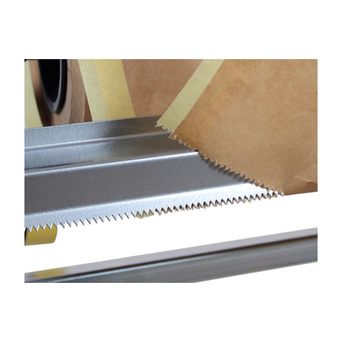 Portarotolo orizzontale per carta da mascheratura compatibile con rotoli di 30cm, 60cm e 85cm. La struttura consente di srotolare la carta, applicare la banda autoadesiva sul bordo e tagliare la lunghezza desiderata, facilitando le operazioni di mascheratura.