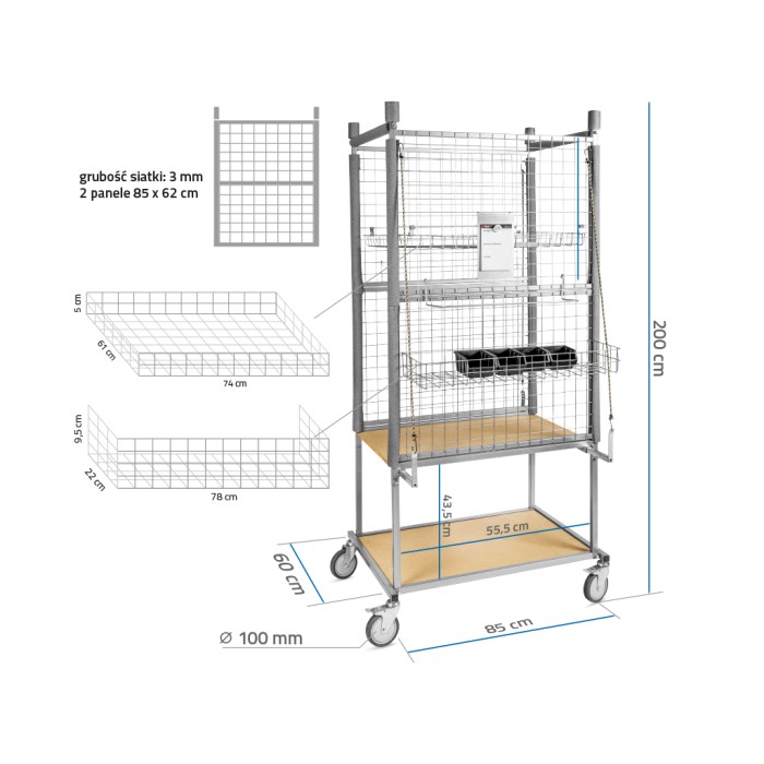 Carrello progettato per lo stoccaggio sicuro di vari elementi della carrozzeria. Consente di conservare in sicurezza componenti come cofani, portelloni, fari, paraurti, parti di tappezzeria e altri elementi smontati durante le riparazioni.